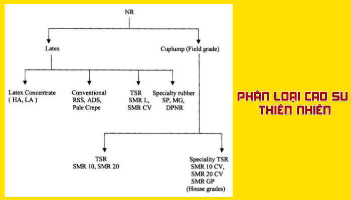 Cao su thu được từ cây cao su chủ yếu dưới dạng latex. Sản phẩm phụ của quá trình thu latex là mủ chén, chúng thực sự là phần latex còn sót lại trong chén, được thu gom vào những ngày sau khi thu hoạch latex cùng với một lượng nhỏ mủ cây. Thông thường, latex đóng góp khoảng 80% lượng cao su, trong khi lượng mủ chén và mủ cây chiếm khoảng 20%. Cao su nhiên thiên (NR) được chế biến thành latex hoặc cao su khô phụ thuộc vào ứng dụng của nó. Các sản phẩm được ngâm bao phủ cao su, bọt, tơ được sản xuất từ latex; trong khi các sản phẩm khác (ví dụ, lốp xe) được làm từ cao su khô. Các loại cao su thiên nhiên thương mại khác nhau được minh họa ở hình vẽ bên dưới.