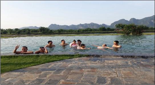 Sang đến ngày thứ hai, sau bữa sáng mọi người cùng nhau trải nghiệm những dịch vụ nơi đây, đi bơi với hệ thống bơi có bể nóng và bể lạnh, đi xe điện, xe đạp đôi thăm quan cảnh đẹp của khu resort với những con đường đầy trúc xanh, với những dãy núi hùng vĩ, với những dãy nhà ngang kiểu cổ kính…