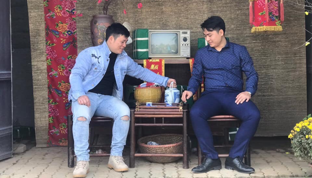 Backdrop được dựng lên miêu tả không khí Tết xưa.