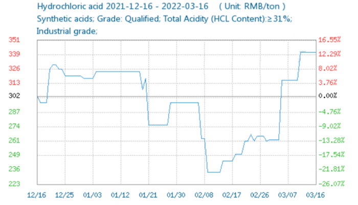 Acid hydrochloric, chất dùng trong sản xuất mốt số hợp chất hữu cơ để cho ra nhựa PVC, tại Trung Quốc biến động về giá trong thời gian vừa qua. Giá mặt hàng này ngày 15/3 là 341 nhân dân tệ/tấn (53,6 USD/tấn), tăng 30,6% so với ngày 5/3. Tính từ đầu năm tới nay, giá loại acid này tăng hơn 6%.
