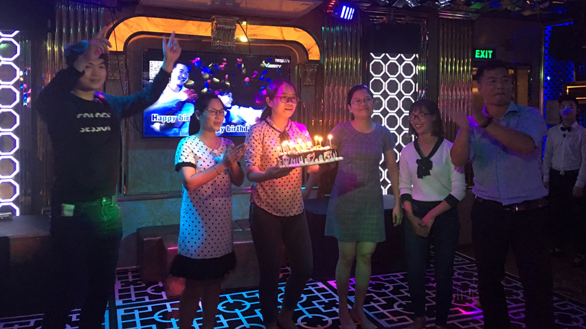The birthday cake was brought out, the birthday song was sung by all people to wish the employees whose birthday were in quarter 4 having a very joyful, happy birthday and success on their chosen way.