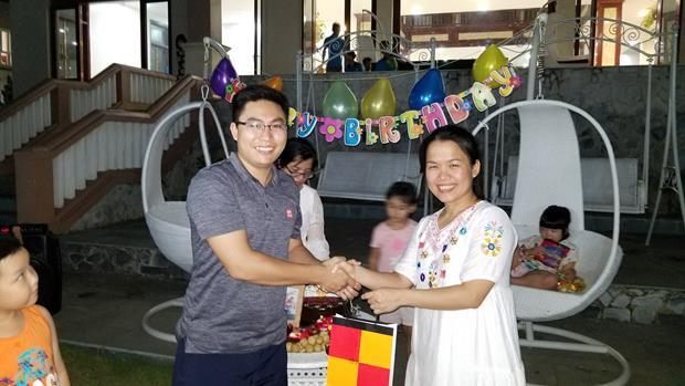 Mr Huyên tặng quà Ms Thủy với lời chúc : “ Chúc chị sức khỏe, luôn luôn xinh đẹp, trẻ trung và thành công trong cuộc sống”