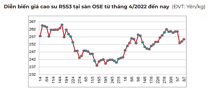 On July 8, the price of RSS3 rubber for delivery near term was at 255.4 yen/kg (equivalent to 1.9 USD/kg), down 2% compared to the end of June, but up 17.3% over the same period in 2021.