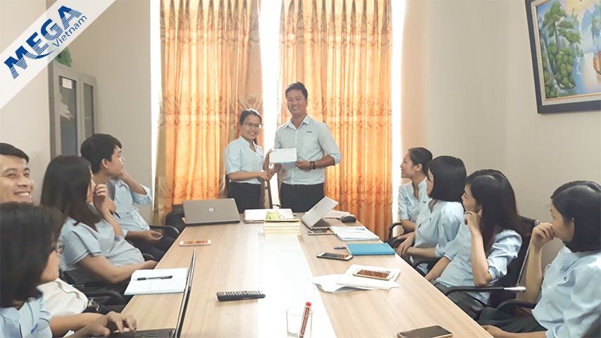 Ms Thủy – Giám đốc trao thưởng cho Mr An trong cuộc họp văn phòng