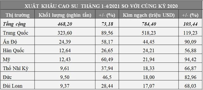 Theo số liệu thống kê sơ bộ của Tổng cục Hải quan, tháng 4/2021 cả nước xuất khẩu 62.013 tấn cao su, thu về 110,2 triệu USD, giảm 44% cả về khối lượng và kim ngạch so với tháng 3/2021. Tuy nhiên, so với cùng tháng năm 2020 thì tăng mạnh 46,9% về lượng, tăng 105,4% về kim ngạch. Theo đó, tính chung 4 tháng đầu năm nay, xuất khẩu cao su tăng mạnh 73,2% về khối lượng so với cùng kỳ năm trước, đạt 468.202 tấn, kim ngạch còn tăng mạnh hơn, thêm 103,4% đạt 784,4 triệu USD.